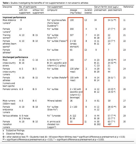 En varios estudios diseñados para probar el efecto de la suplementación con hierro en parámetros relacionados con la aptitud física se ha observado que en la mayoría de los casos, los corredores con insuficiencia de hierro mejoran el rendimiento en respuesta a la intervención del suplemento.