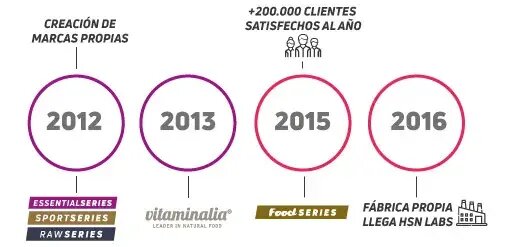HSN nació en 2007 como una tienda de venta de complementos alimenticios fabricados por otras empresas, distribuíamos marcas de referencia internacional como Optimum Nutrition, Muscletech, Bolero, etc. Siendo únicos distribuidores oficiales en España de algunas como Now Foods.