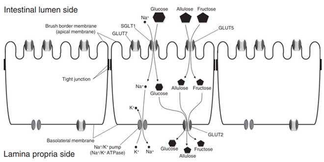 La alulosa compite con la fructosa a nivel de transportador GLUT5, que es el encargado de introducirlas desde el intestino al interior celular, y con la glucosa y la fructosa a nivel del GLUT2 para pasar desde el enterocito (célula intestinal) a la circulación sanguínea.
