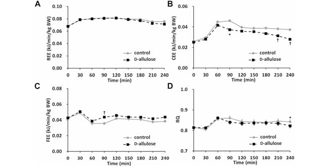 A pesar de que el gasto energético basal (REE en gráficas) no fue distinto entre grupos, la ingesta de alulosa aumentó significativamente la utilización de grasa (FEE en gráficas) a los 90 minutos, siendo menor en este grupo la utilización de carbohidratos (CEE en gráficas) y el cociente respiratorio (RQ en gráficas).