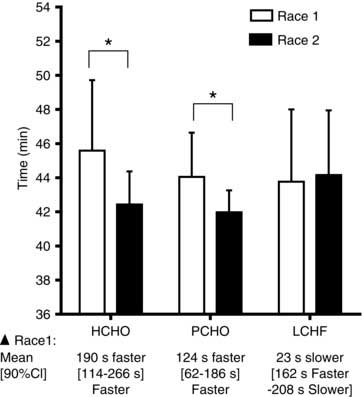 Los tiempos de carrera para marcha de 10 km realizados por la IAAF en atletas de élite realizados antes (Carrera 1) y posteriores (Carrera 2) del experimento; alta disponibilidad de carbohidratos (HCHO), disponibilidad periodificada de carbohidratos (PCHO), o dietas cetogénicas bajas en carbohidratos y altas en grasas (LCHF)