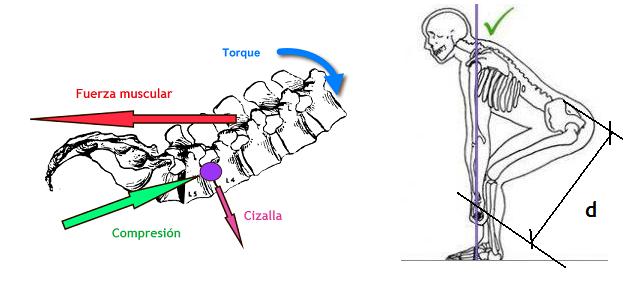 Mayor brazo de palanca implica que el torque lumbar es máximo, aumentando las fuerzas de compresión y cizalla (corte) sobre las vértebras lumbares