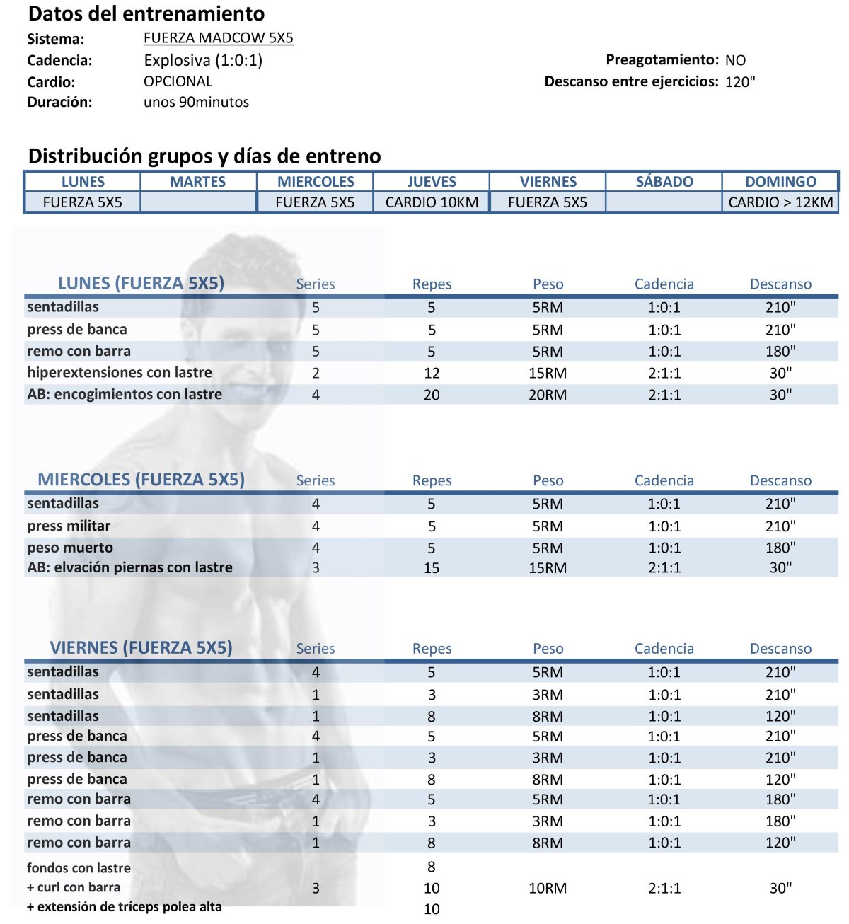 Cambiamos el objetivo del tipo de rutina pasando a una rutina de fuerza Madcow bajando a 3 días de pesas, y dos días de cardio de volumen (siempre opción el ejercicio aeróbico):