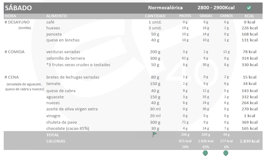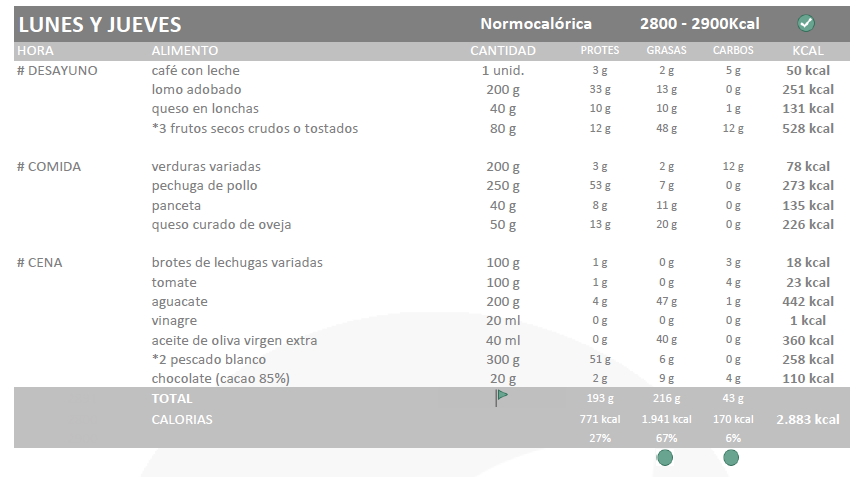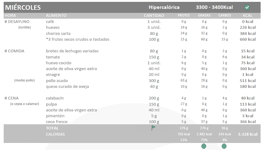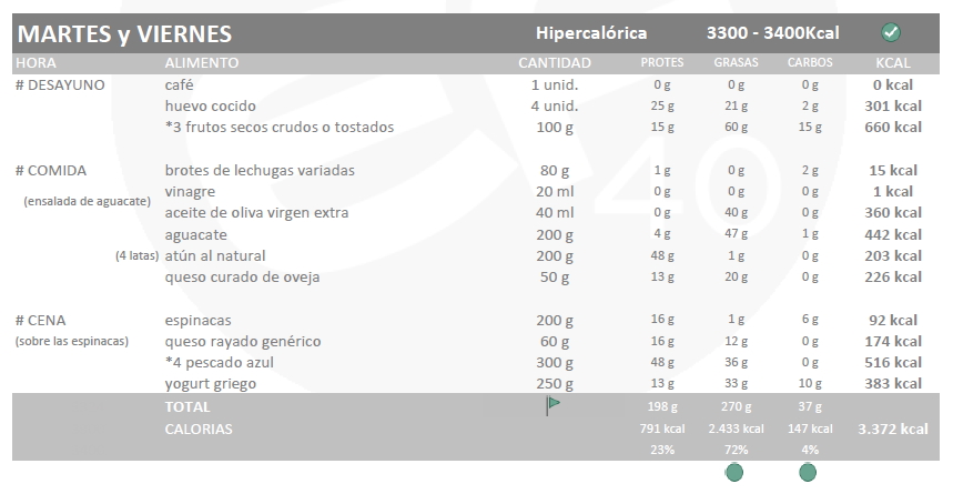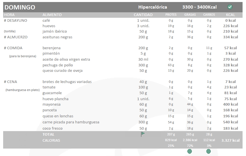 Empiezo con una dieta no muy elevada, de unas 3300kcal los días hipercalóricos que son los que voy a entrenar y normocalóricos de unas 2900kcal el resto de días. Como ya digo esto va a ser el mínimo, y aunque no suele tener hambre en keto llevaré siempre conmigo alimentos que pueda comer en cualquier lado.