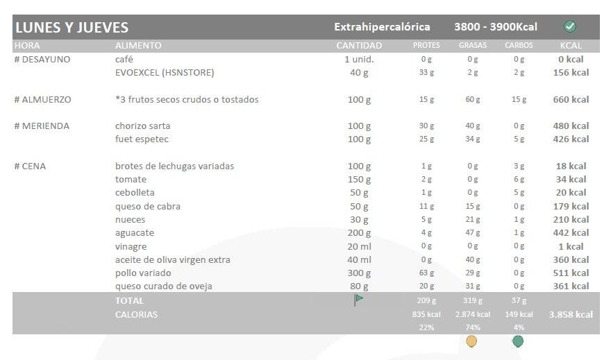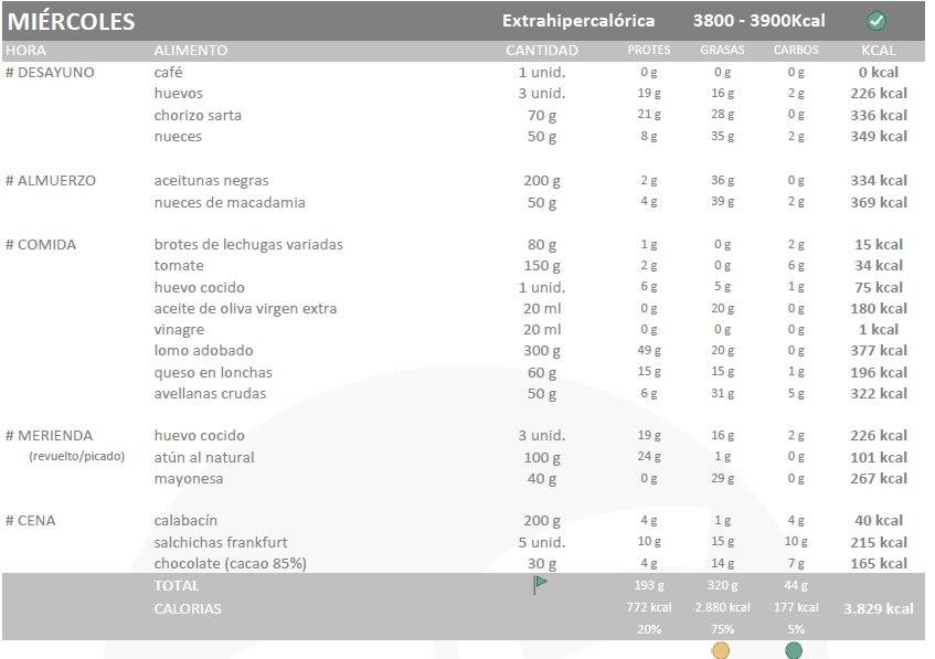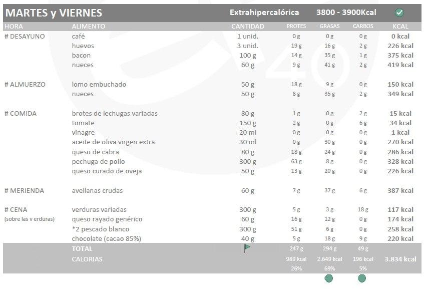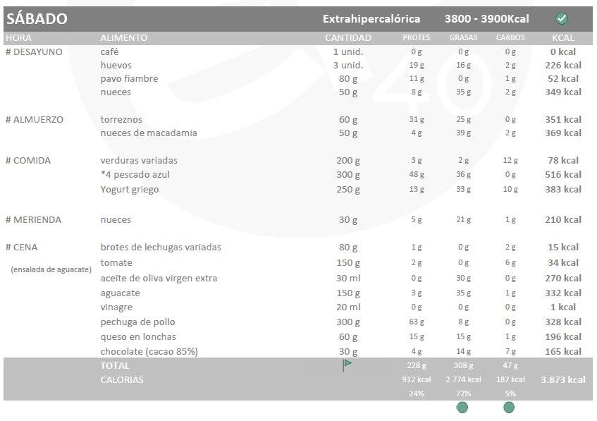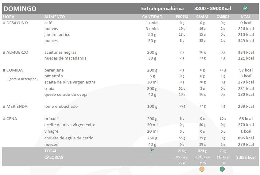 La dieta no es 100% estricta a lo planteado pudiendo variar los platos por cuestiones de tiempo, pero siempre en similares cantidad de calorías y dentro de una dieta cetogénica.
