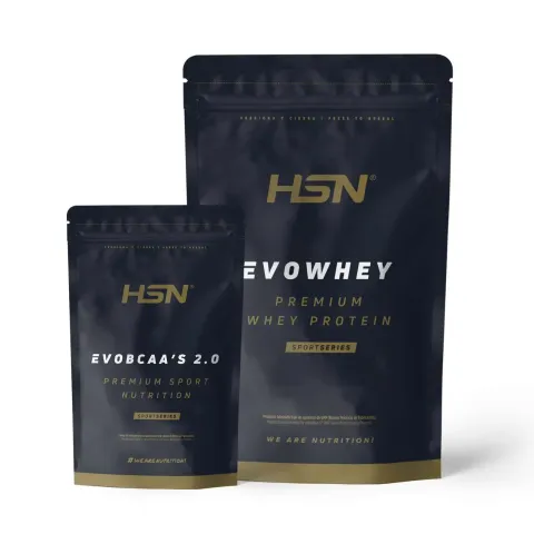 Pack doble que combina Evowhey Protein 2 kg (concentrado de suero lácteo) y Evobcaa's 500 g (BCAAs con L-Glutamina Kyowa® en ratio 12:1:1), dos de los más vendidos de HSN SportSeries.