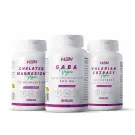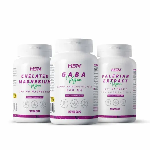 - Pack con 3 complementos en cápsulas vegetales: Bisglicinato de Magnesio 175 mg (120 veg caps), GABA 500 mg (120 veg caps) y Extracto de Valeriana 5:1 500 mg con vitamina B3 (120 veg caps).