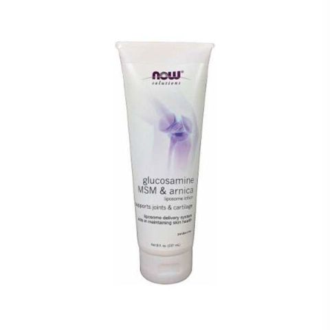 Loción Corporal con Glucosamina + MSM + Arnica 237ml de Now Foods es una crema a base de jugo de hoja de Aloe barbadensis.