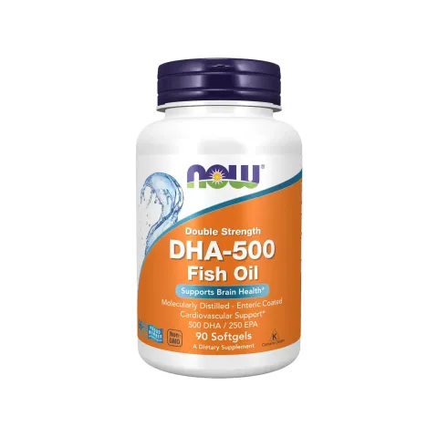 DHA-500 de Now Foods es un complemento alimenticio en softgel a base de concentrado de aceite de pescado (EPA y DHA).