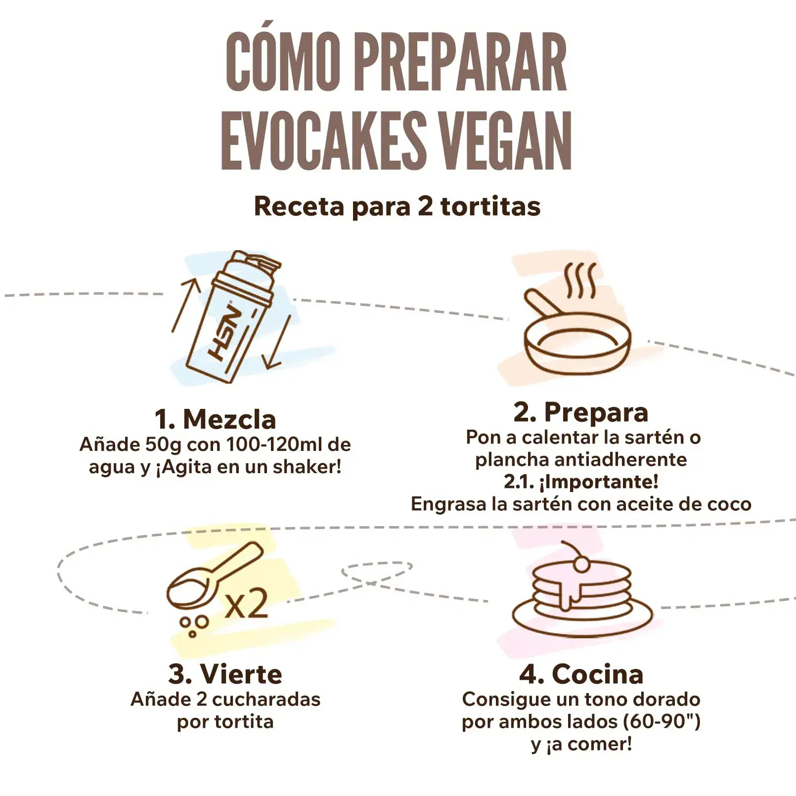 Evocakes Vegan es la versión vegana de nuestras Evocakes 2.0 (Tortitas proteicas), que es uno de nuestros productos más clásicos, un preparado en polvo para tortitas altas en proteínas, que contiene proteínas lácteas (razón por la cual no es vegano). Lo hemos reinventado en una alternativa vegana, con todo el sabor y la misma calidad nutricional de las Evocakes que conoces. Aunque no seas vegano, ¡dales una oportunidad!