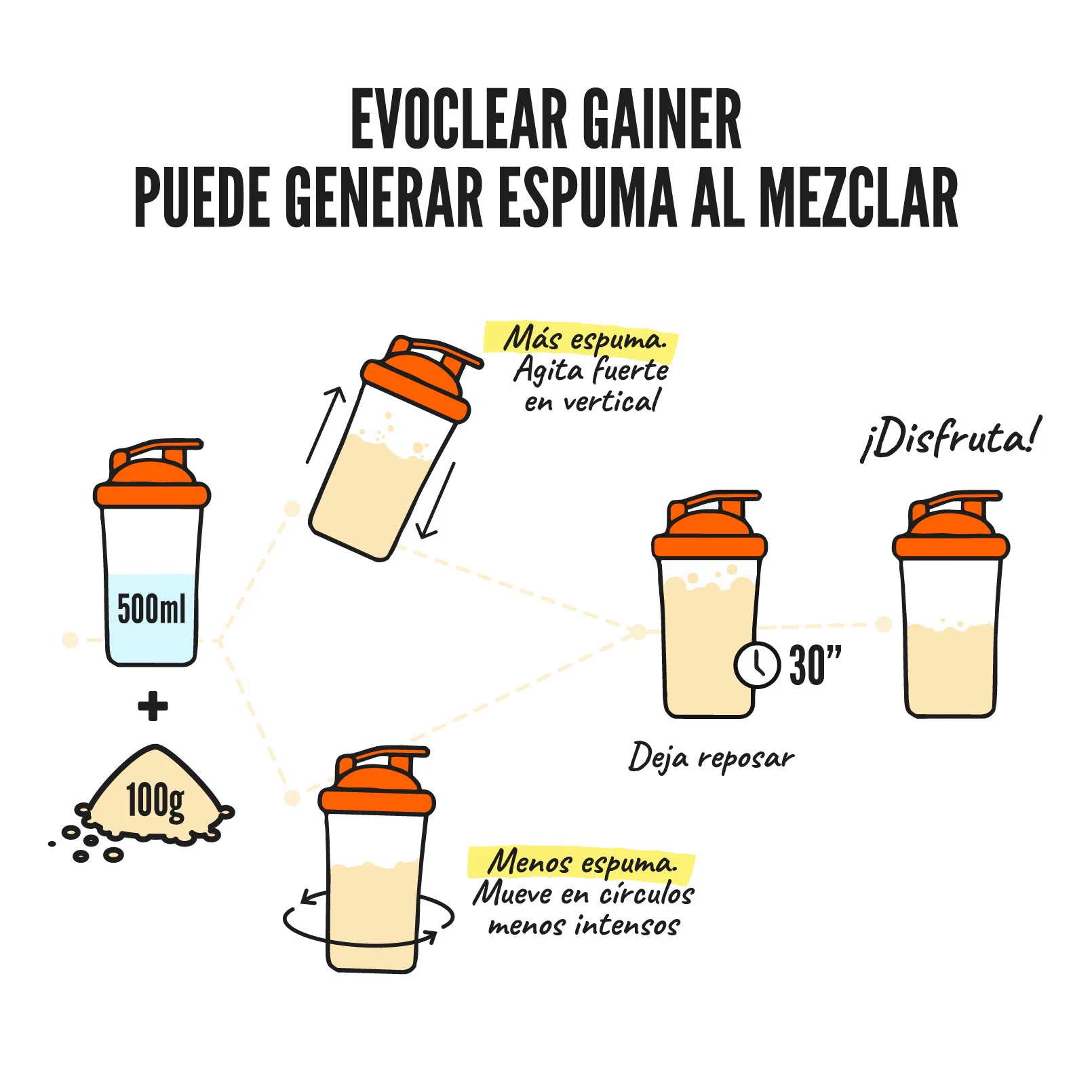 Esta espuma va desapareciendo si se deja reposar la mezcla una vez preparada, sin embargo, es algo que puedes evitar fácilmente si remueves la mezcla con varillas, ya que Evoclear Gainer tiene una excelente capacidad de mezclado, no genera grumos, y así aireas menos la mezcla, reduciendo significativamente la generación de espuma.