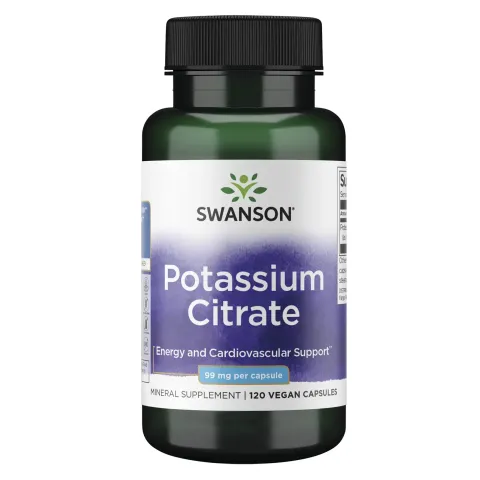 Citrato de Potasio 99mg de Swanson es un complemento alimenticio elaborado con citrato de potasio puro en cápsulas vegetales.