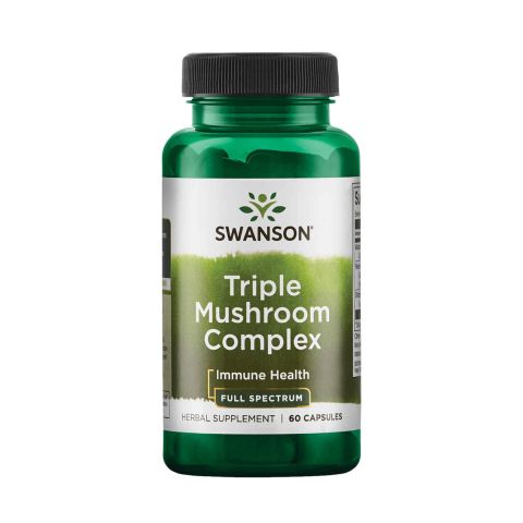 Full Spectrum® Triple Hongos Complex de Swanson es un complemento alimenticio a base de un complejo de tres hongos (Maitake, Reishi y Shiitake) en cápsulas.