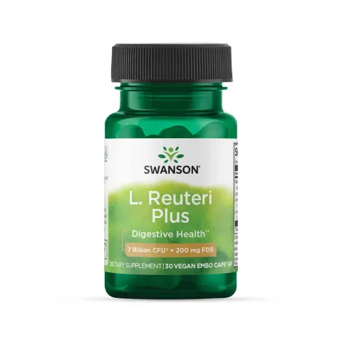 Lactobacillus Reuteri Plus 7 Billion CFU + 200mg FOS de Swanson es un complemento alimenticio en cápsulas vegetales hecho a base de FOS y 3 fermentos bacterianos.