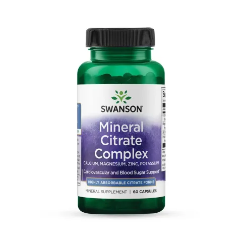 Mineral Citrato Complex de Swanson es un complemento alimenticio en cápsulas a base de minerales esenciales como son el Calcio, el Magnesio, el Zinc y el Potasio.