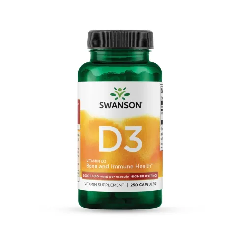 Vitamina D3 2000UI de Swanson es un complemento alimenticio en cápsulas a base de colecalciferol (vitamina D3).