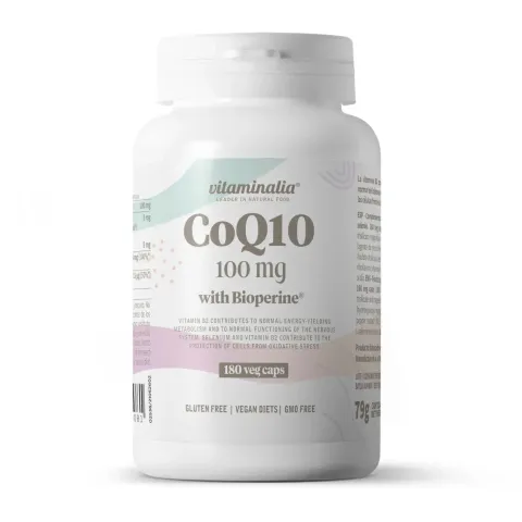 CoQ10 + Bioperine® de Vitaminalia es un complemento alimenticio en cápsulas veganas, a base de Ubiquinona (Coenzima Q10) y Extracto de pimienta negra Bioperine® estandarizado al 100% de piperina. La fórmula ha sido enriquecida con riboflavina y selenio.